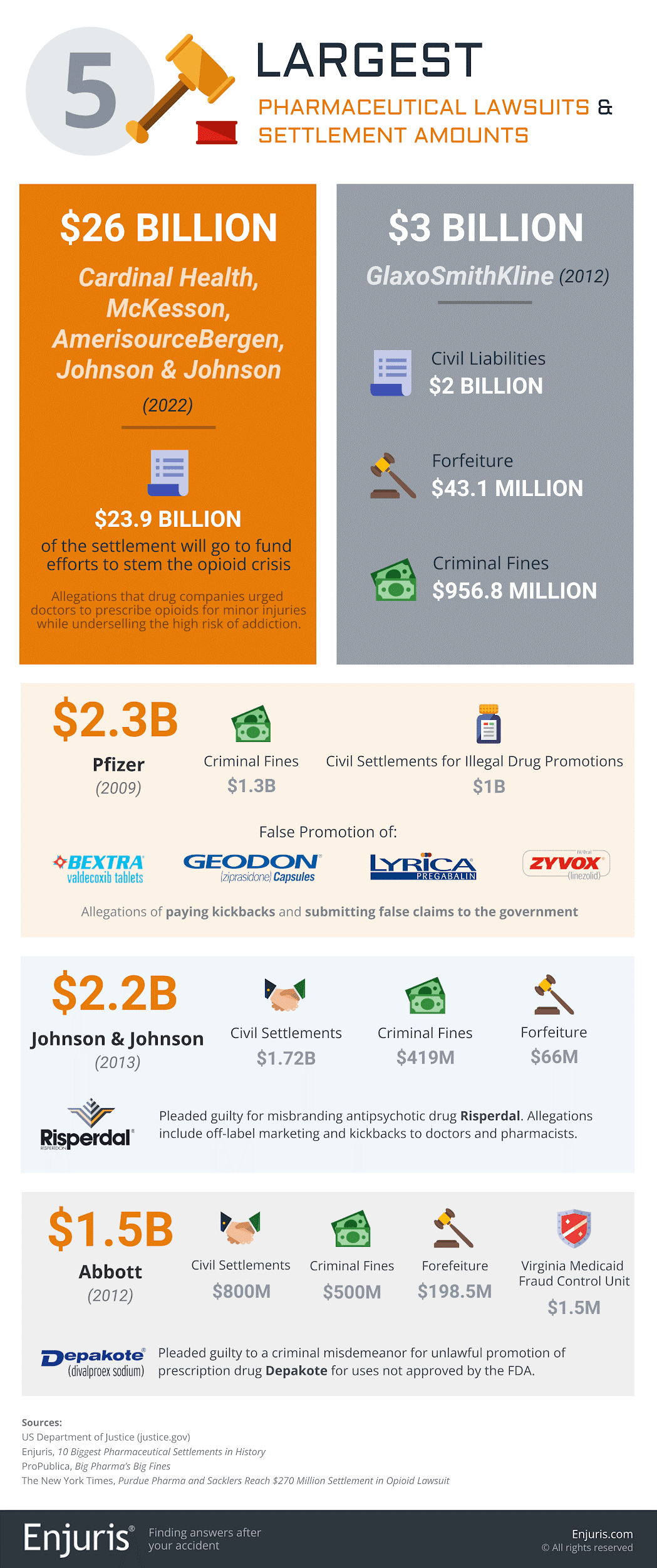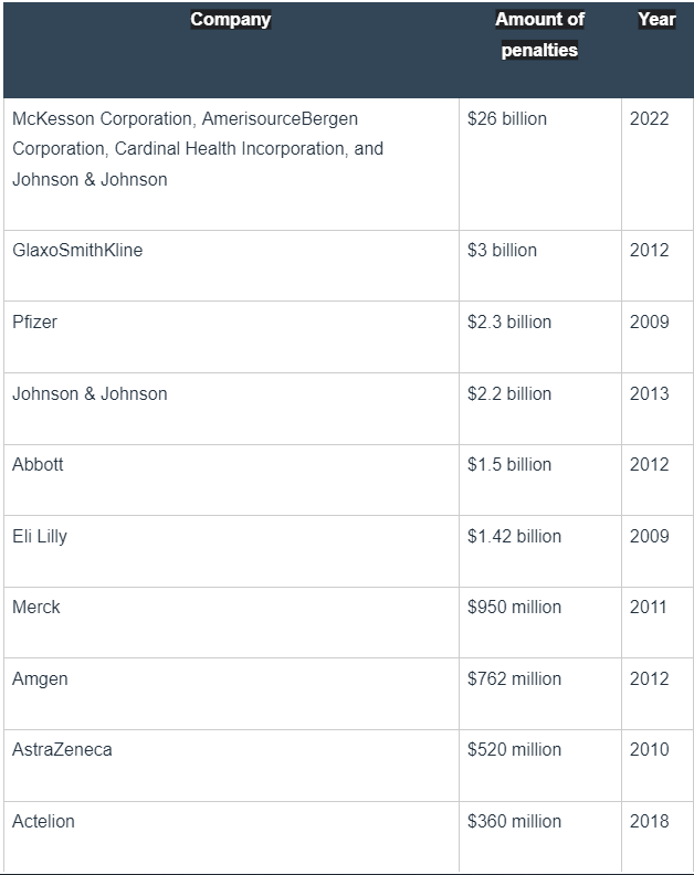 Let’s take a look at the top 10 pharmaceutical settlements, in order of dollar amounts (highest to lowest). These can include a combination of criminal fines and civil settlements:
